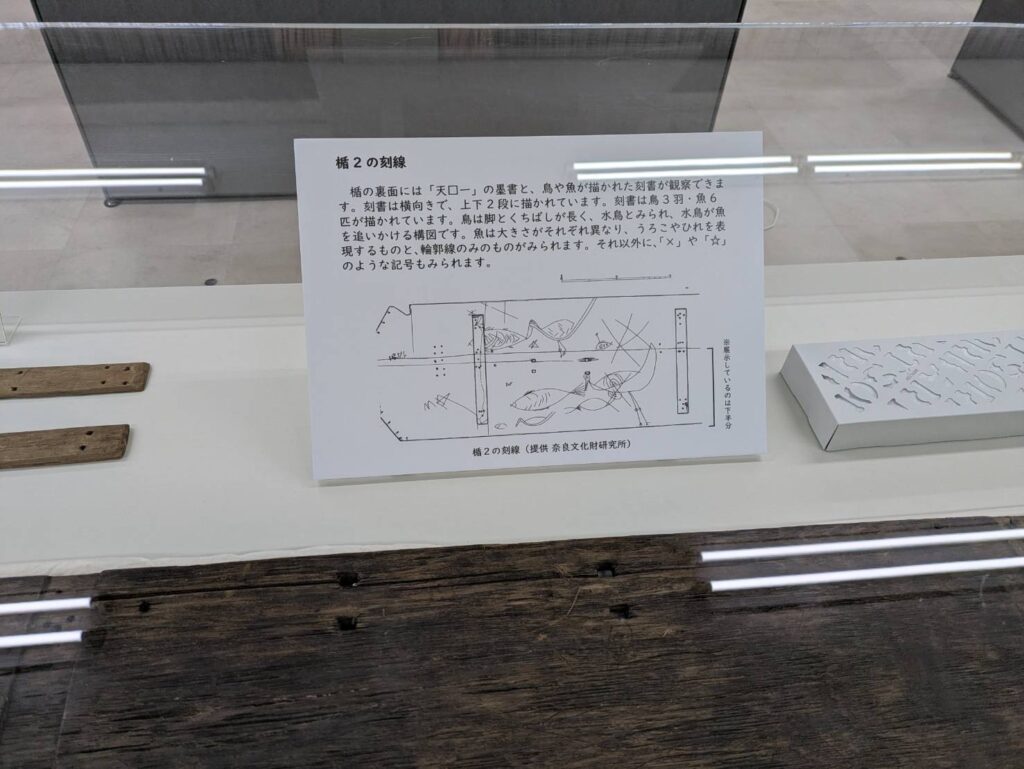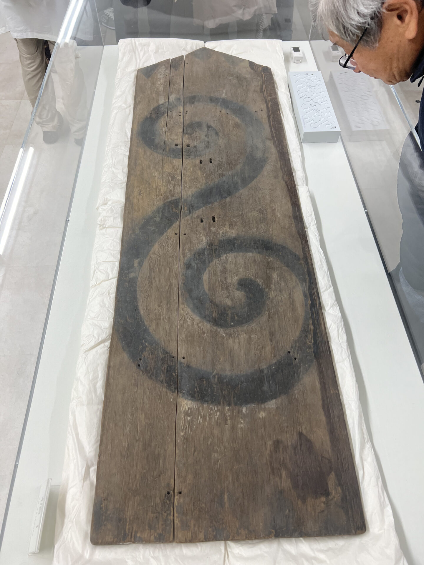 高さ1.5m、幅50cm、厚さ2~3cmと想像以上の大きさでした。ガラスケース外の展示品は出土品を参考に復元されたものです。