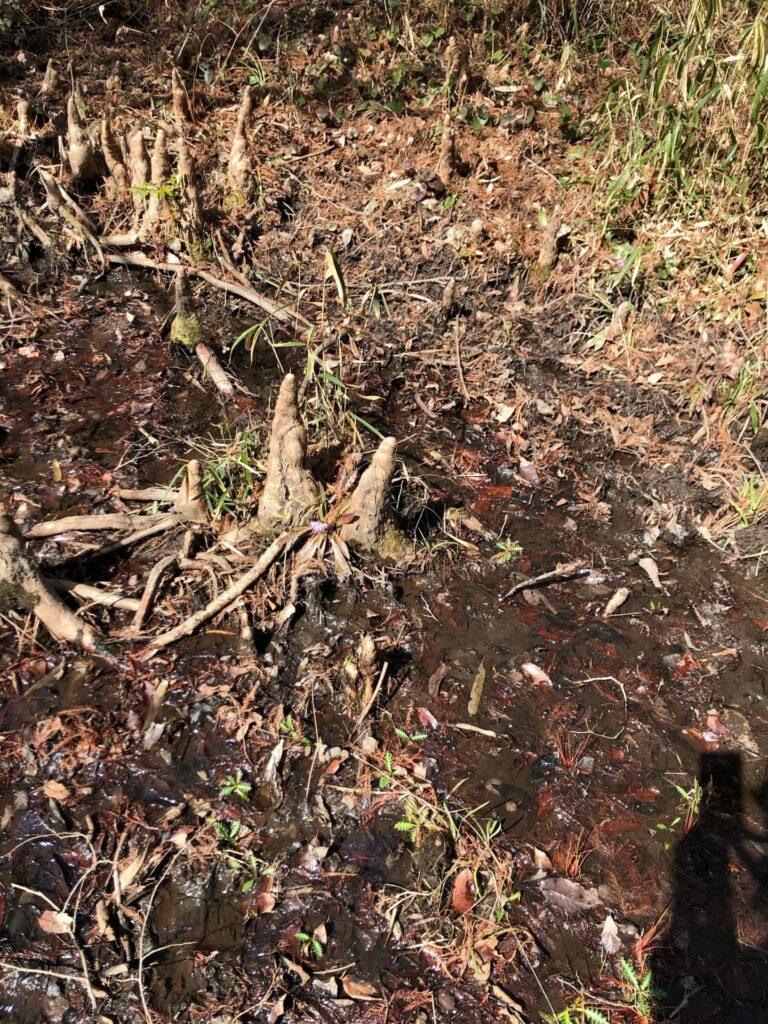 交野に足を踏み入れカタクリの花は見られませんでしたが、ラクウショウの群生地の木道を歩きました。