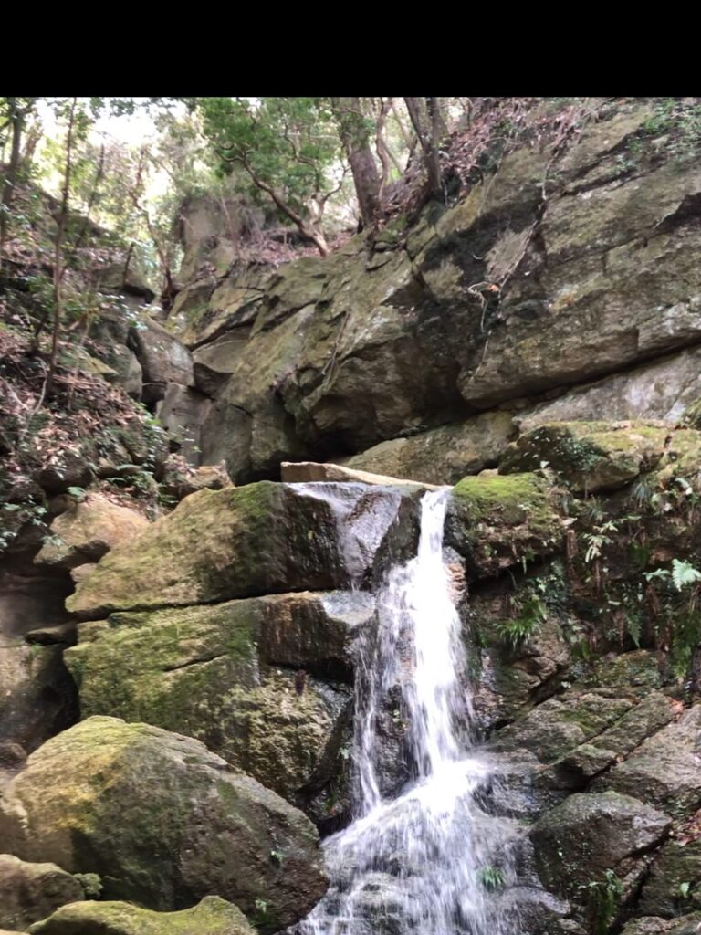 早めの昼食を終えたころからぽつりぽつり雨が降り始めました。ひたすら渓流沿いを下り、月の輪の滝を見てひと息つきます。