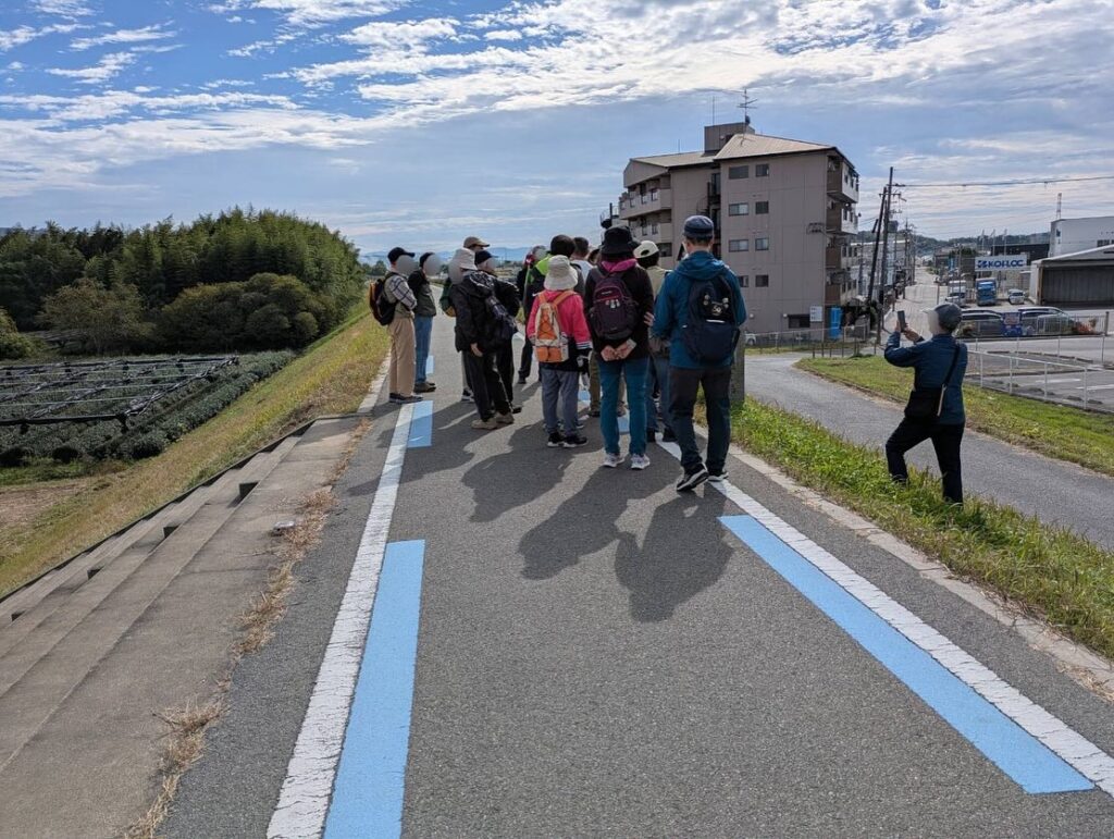 途中、ランドマークである甘南備山や、遠くにそびえる名峰・鷲峰山を望みながら、大河・木津川と低山、そして天井川に挟まれた京田辺市の地勢や、秋の田園風景を堪能していただきました。