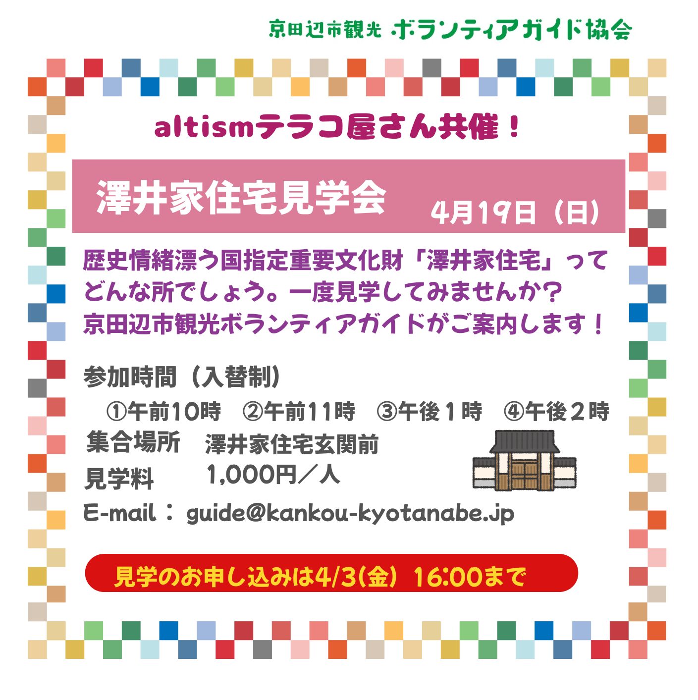 または共催のaltismテラコ屋さんのお問合せ、お申し込みフォームよりお申し込みください。