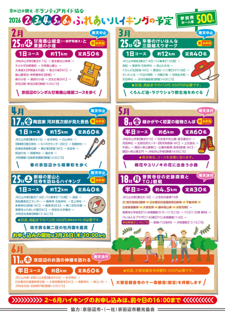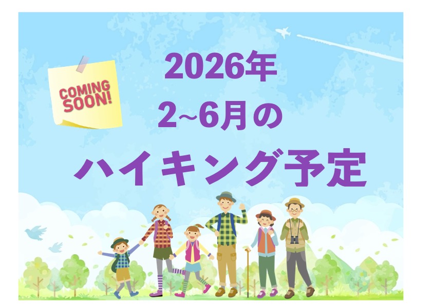 主催ツアー・イベント定期的に開催しています 天候・コースにより、決行する場合と中止の場合があります。各行事の詳細をご覧ください。 2026年2~6月ハイキング予定 下記ハイキングを予定しております。 各ハイキングのお申し込み詳細はもうしばらくおまちください。 お申込みフォームはこちら イベント一覧に戻る